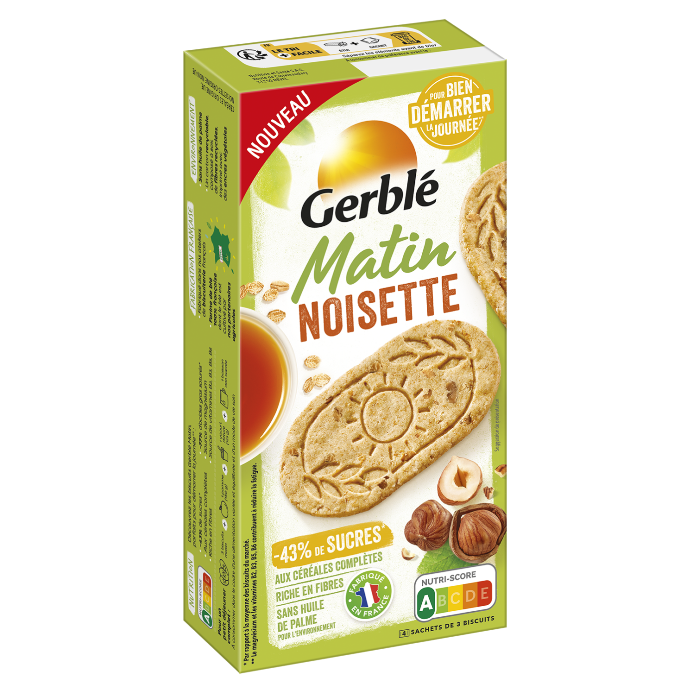 Pour bien démarrer la journée, découvrez les Gerblé Matin noisette ! Nos biscuits sont spécifiquement conçus pour le petit-déjeuner. Avec Gerblé, il n'a jamais été aussi bon de se lever !(1)